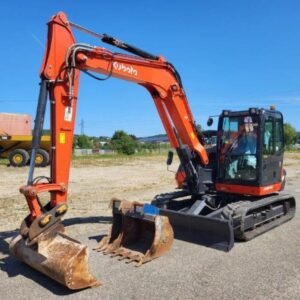Mini-pelle Kubota KX057-4 – 2018, 5,5 T, 600 h, moteur Kubota. Cabine climatisée/chauffée, 3 godets, ligne BRH, garantie 6 mois, prête à l’emploi.